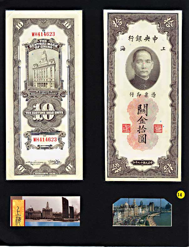 Shanghailanders may remember another type of banknote, the Customs Gold Unit (CGU), that was also issued by the Central Bank of China. The note was usually printed in a vertical format. This issue was primarily intended to facilitate customs payment, however were also for general circulation during and after the war. A 10 CGU note issued in 1930 is illustrated on the left.