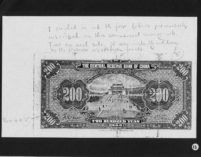Prior to leaving Shanghai, a friend of John (Hans) Wolff - John himself a fellow Shanghailander, pointed out the initials “USAC”, and the date 1945 hidden on a 200 Yuan note that was issued by the Central Reserve Bank of China in 1944. The initials “USAC” and the date 1945 refer to “US Army coming, 1945 “. Wolff recently reproduced the banknote with the initials on a photocopy shown in figures on the left.