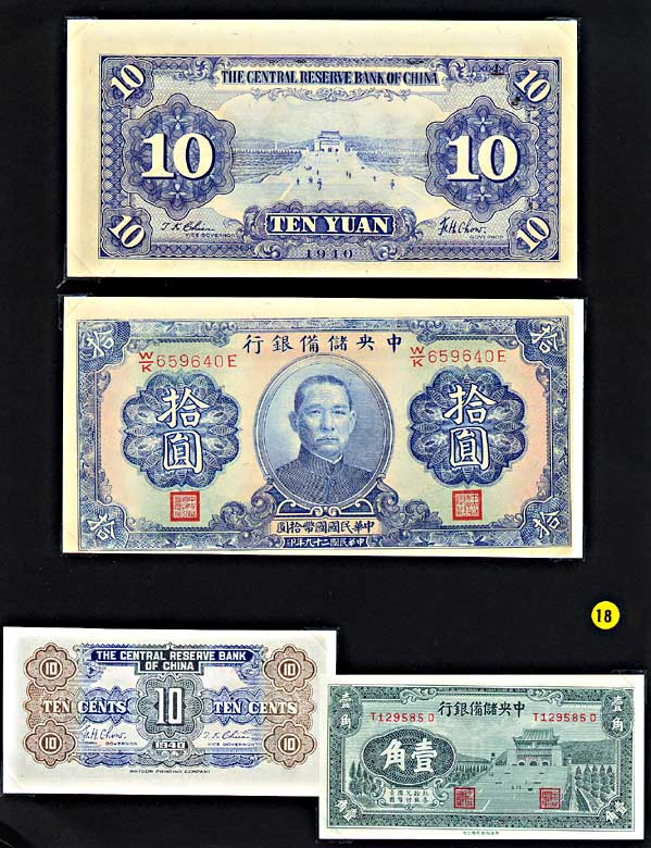 During the existence of the China-Japanese puppet states, Japanese occupation authorities issued currency through Japanese puppet banks. Among those was the Central Reserve Bank of China established in Manchuria in the late 30 ‘s. Operation of the bank, the state bank of the puppet Republic of China at Nanking, began sometime in 1940.