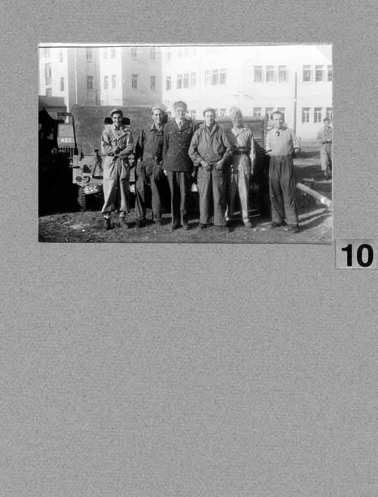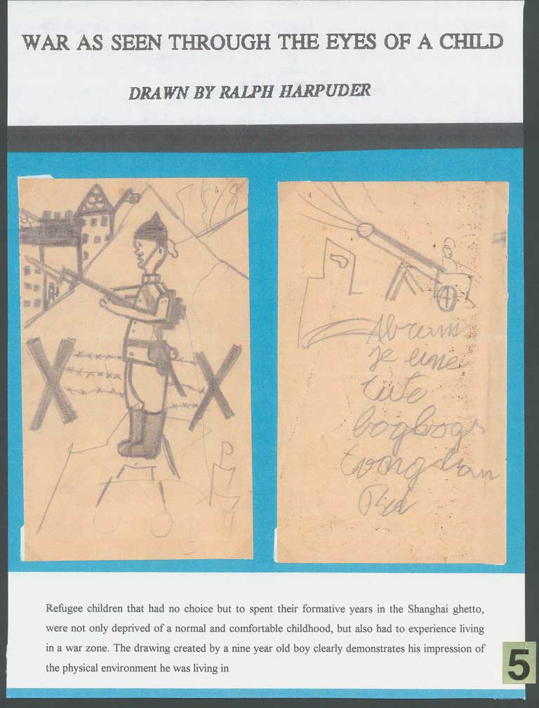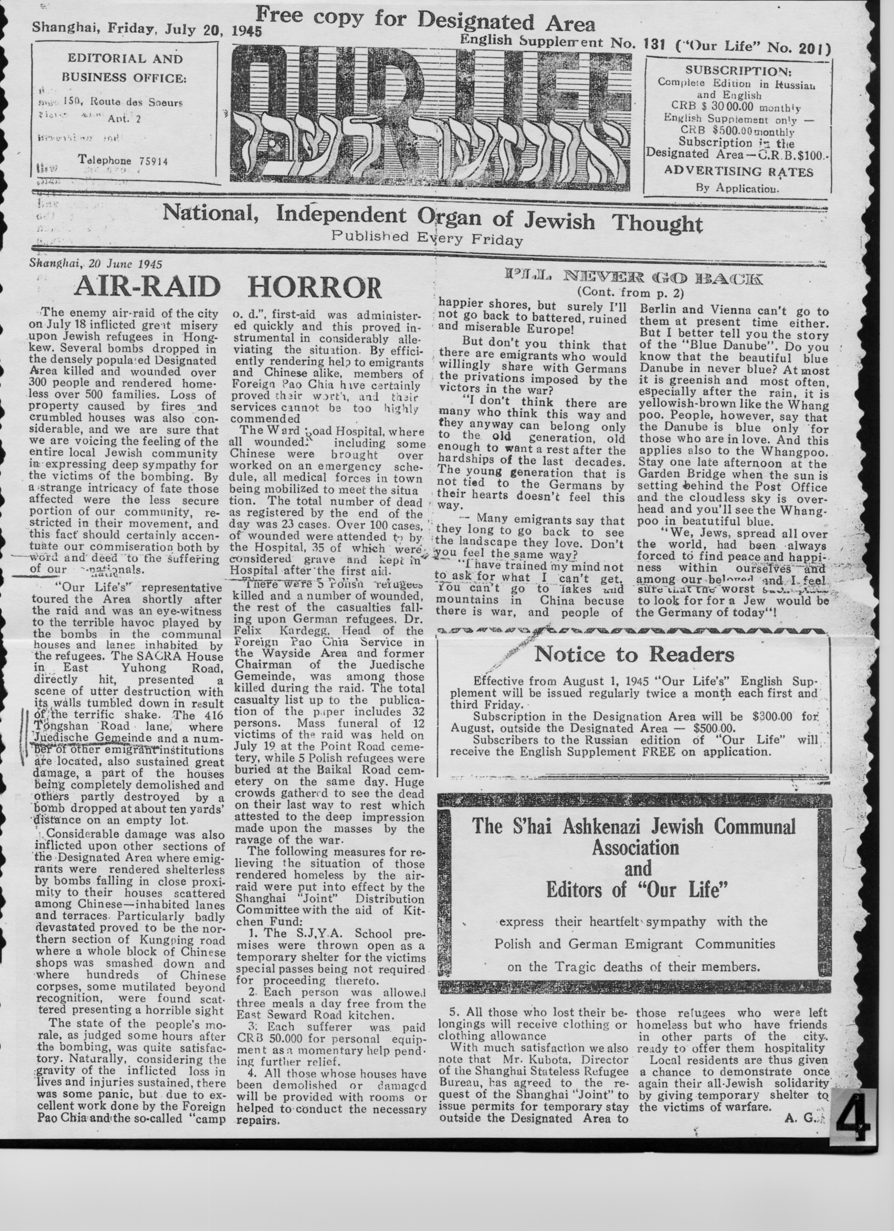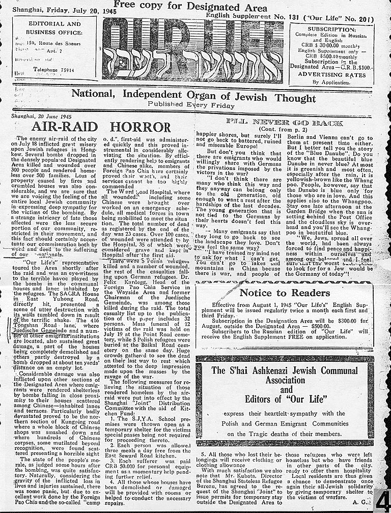 The horrific day began early in the morning when 25 new Douglas twin A-26 bombers, shown in figure three, from the 310 Bomb Group took off from Okinawa carrying 100 lb bombs. Most of the planes reached Shanghai around noontime, flying above a solid overcast that made visibility of their respective targets impossible. The only lead available to the bombardier was the approximate flying time from Okinawa to Shanghai. As a result, some of the 263 bombs dropped on Shanghai landed inside the populated Hongkew Ghetto. A more detailed account of the devastation caused by the stray bombs was printed in the weekly newspaper, "Our Life," National Independent Organ of Jewish Thought, shown in figure four. The following are some personal reactions of children to the bombardment as it occurred, recalled fifty-three years later by the same three Shanghailanders. "I wonder if anyone remembers being in Kadoorie School during the bombardment and hiding under our desks? I was ten years old at the time and have very vivid memories of the incident. My father came to get me during the bombardment and when it was over he carried me home, to avoid seeing the injured and corpses he covered my head and kept repeating, "Close your eyes." (Ruth Spiegler, June 98) "There has never been a July l7~" that I do not recall the bombardment. Like you, I remember hiding under the desk at the Kadoorie School. I do a great deal of lecturing to junior high and high school students about the Holocaust, and never fail to tell them the story of July 17, 1945." (Doris Fogel, August 98) "I was attending Kadoorie School where a lunch program had just started the day before for the children and I was to stay there for lunch. For some reason I just did not want to stay so I went home. My parents were both at home, my brother never used to come home for lunch, but that day he did. It was very unusual for all of us to be home at the same time since my father and brother would be at work. All of a sudden the bombs were falling. The four of us embraced in a circle, and held each other very close so that if we would have been hit, we would all be together. Everything turned pitch black, when it was over I felt like G-d protected us by holding his hands over us. I was very lucky not having to be walked home from Kadoorie School and having to see the devastation and dead on the sidewalk, like many children did. I will never forget July 17, 1945." (Lea Baumann, September, 98) Following Pearl Harbor, air-raid security in Shanghai required all windows to be covered with black-out material during the period following an air-raid alarm. The physical and war related environment was depicted in a drawing by a nine year old boy that lived in the Hongkew Ghetto when all the air-raids occurred. The drawing, shown in figure five, shows a canon and a Japanese Sentry standing guard and holding an open bayonet. Joy and jubilation spread instantly throughout Hongkew when the news about the Japanese surrender was made public. It was only a few weeks later when US. air freighters, fighter planes and bombers, that were in charge of convoy and combat missions in the China-Burma-India Theater arrived at Chiangwan airfield in the Northern part of Shanghai, carrying the American Armed Forces of Liberation. A photo of a row of C-46 air freighters, ready to be overhauled by a crew of refugee mechanics posing in a jeep, is shown in figure six. A photograph of a four-engine US. bomber with my stepfather, Victor Stummer, standing in front of the plane, is shown in figure seven. Chiangwan airfield was one of the targets sought by US. Air Force to be bombed on the 17th of July. A large building at the airfield, illustrated in figure eight, became the US. Headquarters after the American Forces arrived in Shanghai. Located in the building was the office of the American Consulate General that employed a number of civilians and Jewish refugees. Figure nine shows an identification card stating that my step-father is employed by the American Consulate General. In figure ten, we see a group of refugee workers, including my stepfather, posing with US. Air Force officers and crew in front of the building. Salaries paid to civilians by the US. Armed forces in Shanghai were high, affording a very comfortable living for many refugees after the war. Friendship with the US. Forces was made very fast, as shown in a photograph in figure eleven. Here we see a young American sailor visiting a Jewish refugee in a typical house-lane as other refugees were curiously looking on.