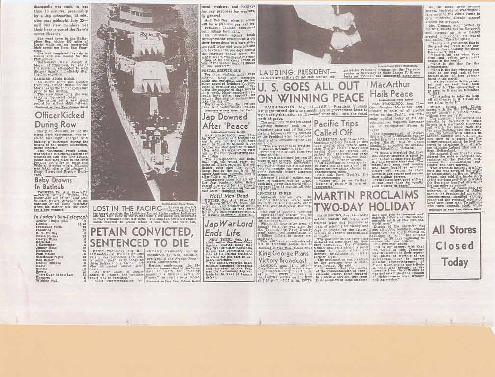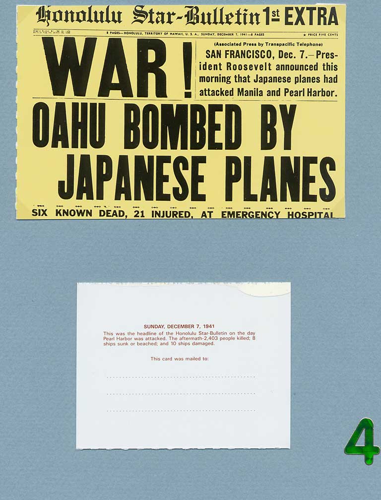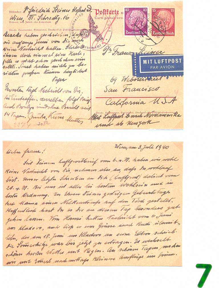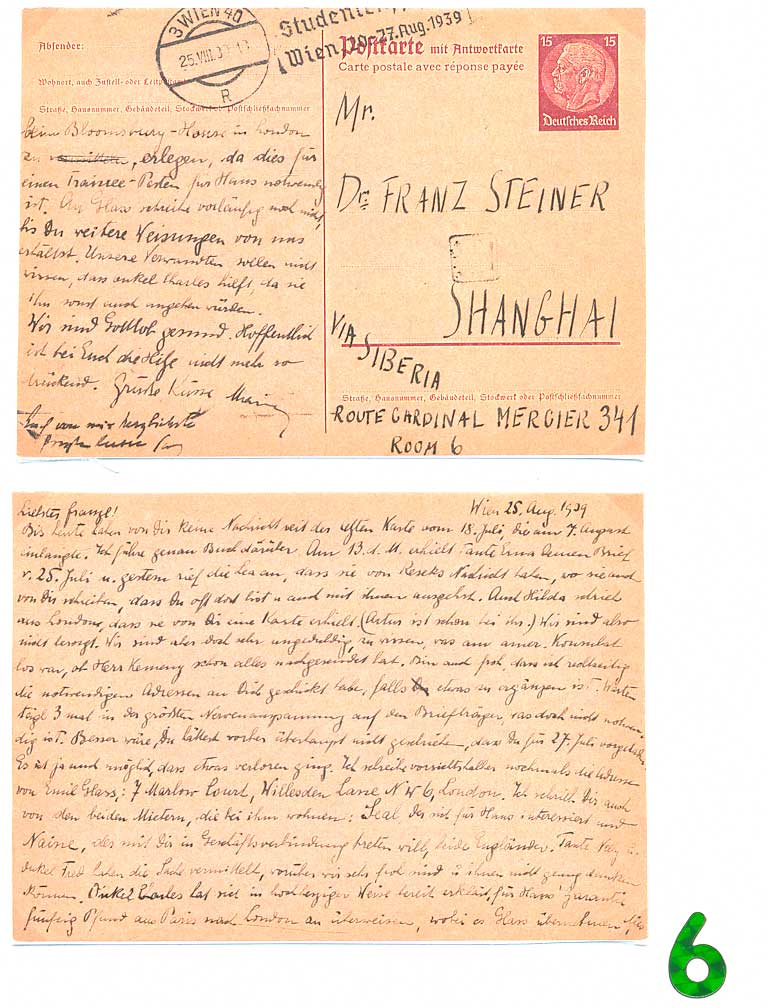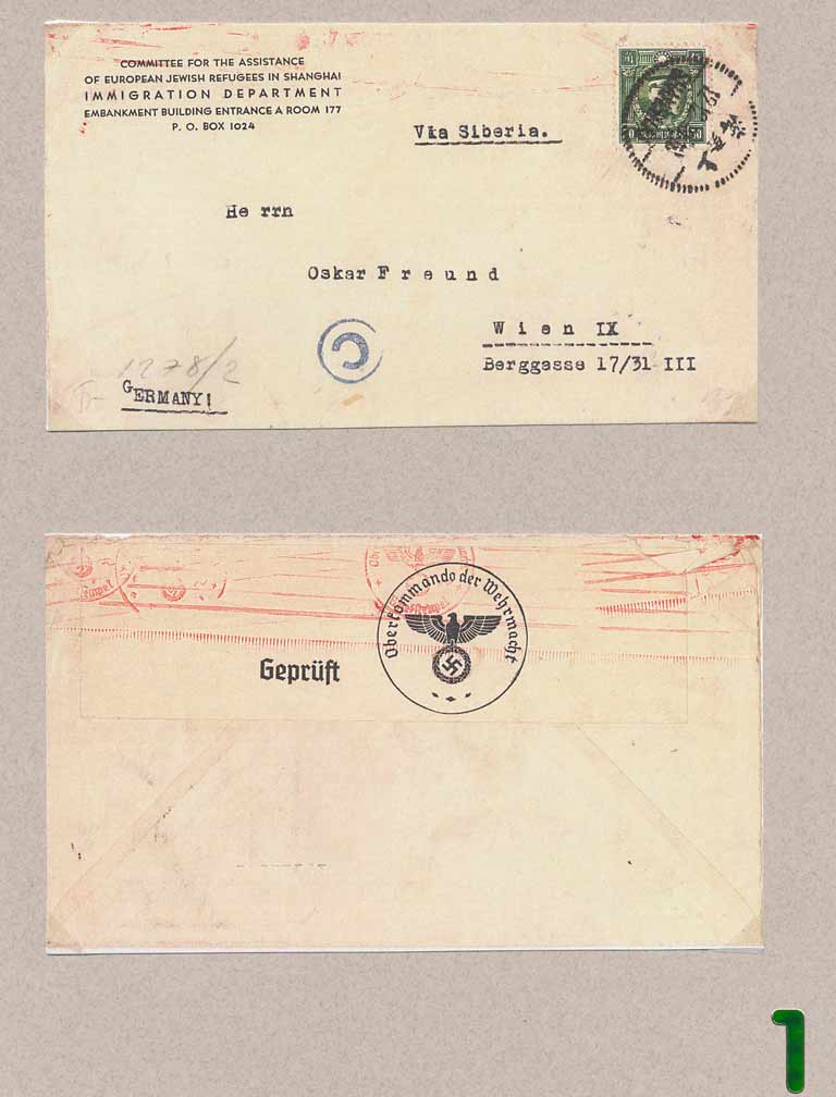 A Pivotal Day for Shanghai Refugees By Ralph Harpuder Emigration of stateless Jews from Nazi occupied lands to Shanghai began around 1938. An envelope mailed to a stateless person in Vienna from the Committee for the Assistance of European Jewish Refugees in Shanghai-Immigration Department, censored by the Nazis, is shown in figure one. The envelope contained a letter stating the status of future immigration to Shanghai. A first impression of Shanghai by a Jewish refugee, written on a piece of stationary still kept from the ship (Lloyd Triestino Line), is shown in figure two and figure three. Shortly after all the refugees somehow adjusted to their primitive surroundings in a country that was strange to them, a new period of uncertainty erupted; the attack of Pearl Harbor by Japan. Strolling with my wife last month along Pearl Harbor while visiting our first grandchild in Hawaii, reminded me of the attack of that harbor on the 7” of December, 1941, the day President Roosevelt called “A date which will live in infamy.” The surprise air strike of Pearl Harbor by naval and air forces of the Empire of Japan had cost the lives of 2403 US servicemen and 68 civilians, and sunk or seriously damaged 21 ships of the US Pacific Fleet. A headline in large bold-face letters from one of many newspapers reporting the attack is illustrated in figure four. A memorial that I visited with my wife, built directly over the battleship Arizona, one of five ships sunk during the attack with 1102 men buried under water and oil still emanating from its hull, is shown in figure five. After the attack was made public in Shanghai Hongkew my father made the following rhetorical statement that is still remembered by yours truly after 63 years: “What will happen to us now:” Shanghai was considered by most immigrants as only a very temporary place of refuge till it was safe to return again to their former place of origin or to immigrate to another country. This, however, was not the case as 18,000 displaced persons became stranded after the attack of Pearl Harbor, in a poverty-stricken and war-torn part of the world called Shanghai Hongkew. There were a small percentage of refugees among the last wave of immigrants that were able to leave Shanghai before the war had started. An example are two postcards shown in figure six and figure seven respectively, that were sent by a man to his son. The first was mailed in 1939 from Austria to Shanghai; the second postcard went to the United States. Note, that the letter arrived at a time when emigrating out of Shanghai was no longer possible. The larger percentage of stateless Jews were less fortunate, and thus, their attempt to secure a passage to another country before the war, resulted in futility. A picture postcard shown in figure eight that was sent by a refugee from Shanghai to Vienna, tells about his hope to leave soon for America. Although the war was already in progress, and commercial ships were no longer at sea, there was still hope for receiving financial assistance from overseas. A postcard shown in figure nine was written by my father to his brother-in-law in London, requesting a sum of money to be sent by wire from Switzerland to Shanghai. Almost five years elapsed from the day Japan attacked Pearl Harbor to the Japanese surrender signed on the battleship Missouri, illustrated in figure ten. A photo taken during our visit to Hawaii of the now famous battleship is shown in figure 11 The capitulation by Japan that ended WW1I, shown in a headline in figure 12 and 13, brought new hope to the world for lasting peace, and for all Shanghailanders to embark upon a new life in a country of their choice.
