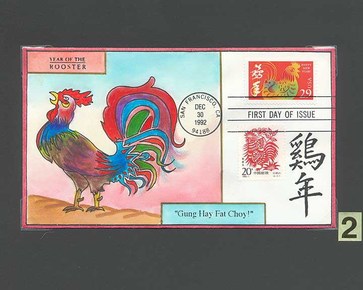 Each animal portrayed on a Chinese Happy New Year stamp represents part of the twelve year repeating cycle which is part of the Lunisolar Calendar. The Year of the Rooster which began the current cycle in 1992 and ended this year, is shown on a First Day Cover of that first issue in figure two.