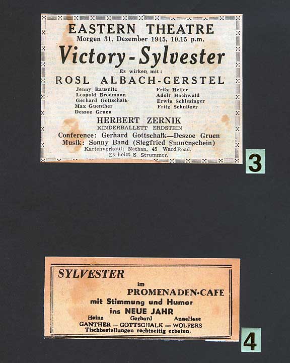 Many refugees living in the Shanghai Ghetto, however, did celebrate occasionally the Western New Year based on the Gregorian calendar which was more familiar to them. In spite of the many hardships they had to face and endure, they entered the New Year most of the time with gayety and laughter. Two advertisements in the Shanghai Echo, a Jewish refugee newspaper, show an announcement of a New Years Eve gala event at the Eastern Theater with the talented Rosl Albach-Gerstel; and a cheerful Berliner “Sylvester” (New Year) evening at the Promenaden-Cafe, also situated in Hongkew, with popular comedian Gerhard Gottschalk Both announcements are shown in Figure three and figure four respectively.